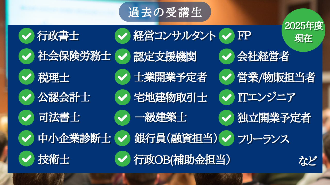 単に「申請書の作り方」ではない、クライアントと接する際に必要なリアルな実務に関わる知識を学んで頂きます。
