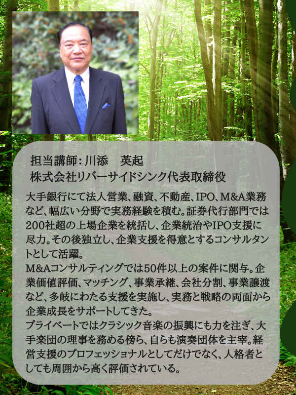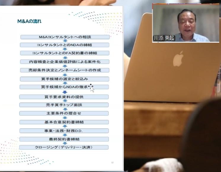 そのため、担当講師である川添先生はこれまで培ったM&Aや事業承継のノウハウを出来る限り公開していきたと考えていますが、講師を出来る年数に限りがあることが想定されます。