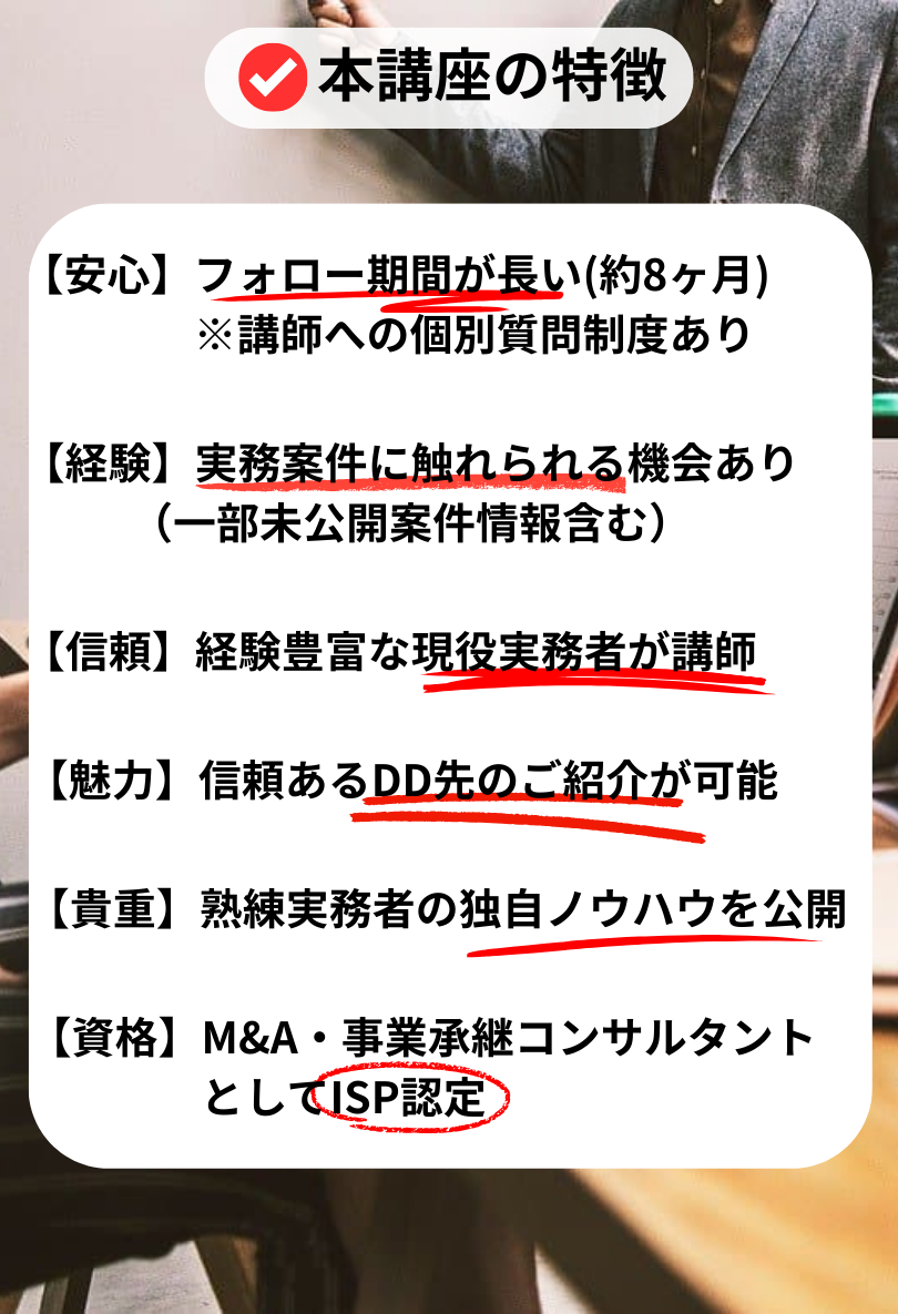【「人と人を結びつけるコミュニケーション能力さえあれば、M&A業務はそれほど難しくない」】——これは、あるベテランコンサルタントから伺った言葉です。実際、M&A業務は適切に分業を行えば、経験の浅い方でも十分に参入できる分野です。 その理由のひとつが、DD(デューデリジェンス)の外注化にあります。 M&Aにおいては、対象企業の財務、法務、事業内容など多角的な調査・分析が必要となりますが、コンサルタント自身がすべてを担うケースはほとんどありません。むしろ客観性を確保するためにも、調査・分析は専門家へ外注するのが一般的です。 ただし、新規参入者にとって信頼できるDDの外注先を見つけるのは容易ではありません。 そこで本講座では、受講生の方が必要に応じて活用できるよう、講師が信頼できるDD先を案件に応じてご紹介いたします。ぜひ有効にご活用ください。